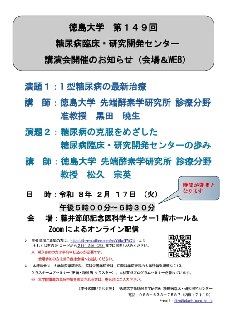 日 時 令和8年2月6日(金)14:50-16:20 場 所 徳島大学病院 西病棟11階 日亜メディカルホール 演 題 「臓器の生物学と糖尿病 ―骨格筋と腸管を中心に—」 講 師 小川 渉 先生(神戸大学大学院医学研究科 […]