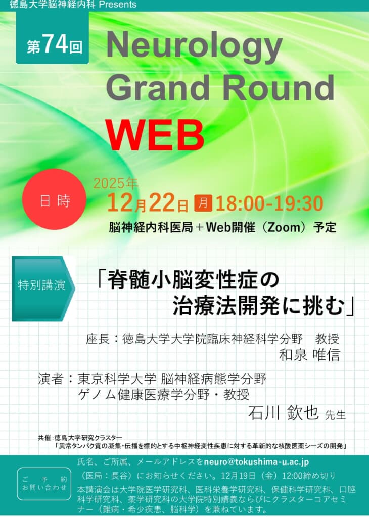 日時 令和7年12月22日(月)18:00-19:30 開催形式 脳神経内科医局+WEB開催(Zoom)予定※受講希望の方は、12月19日(金)12:00までに、 neuro@tokushima-u.ac.jp(臨床神経 […]