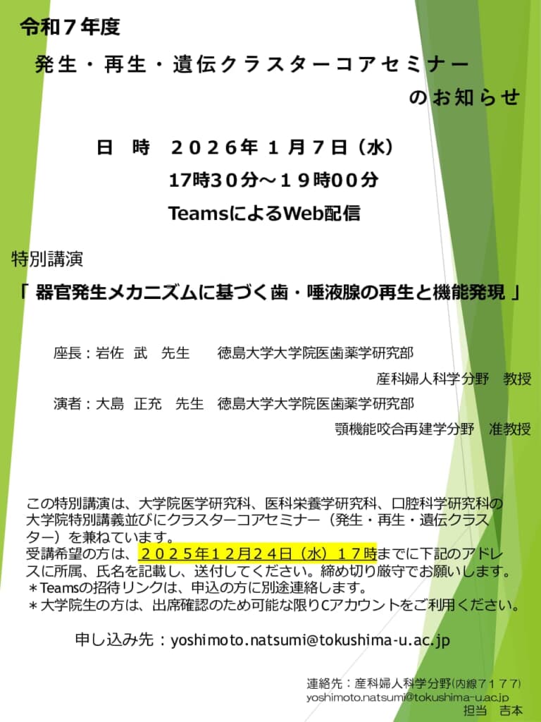 日 時 令和8年1月7日(水)17:30-19:00 開催形式 TeamsによるWeb配信受講希望の方は、2025年12月24日(水)17時までに次のアドレスに所属、氏名を記載し、送付してください。締め切り厳守でお願い […]