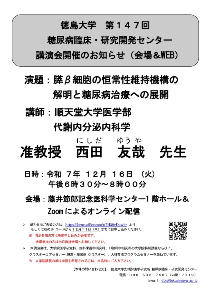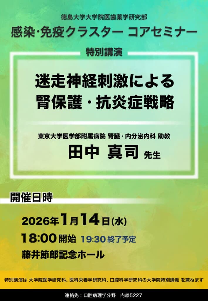 日 時 令和8年1月14日(水)18:00-19:30 場 所 徳島大学蔵本地区 藤井節郎記念ホール 演 題 「迷走神経刺激による腎保護・抗炎症戦略」 講 師 田中 真司 先生(東京大学医学部附属病院 腎臓・内分泌内科 […]