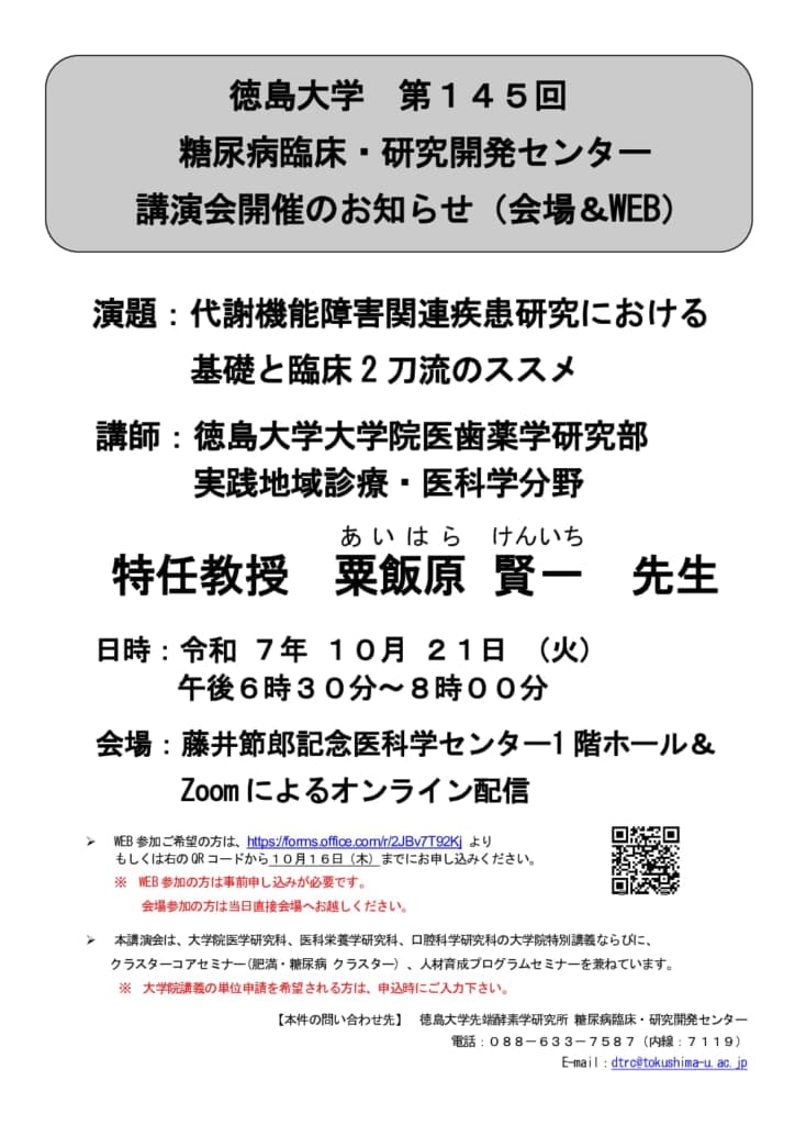 日時 令和7年10月21日(火)18:30〜20:00 開催形式 ハイブリッド開催会場:藤井節郎記念医科学センター1階ホール&Zoomによるオンライン配信※受講希望の方は、10月16日(木)までに、https://for […]
