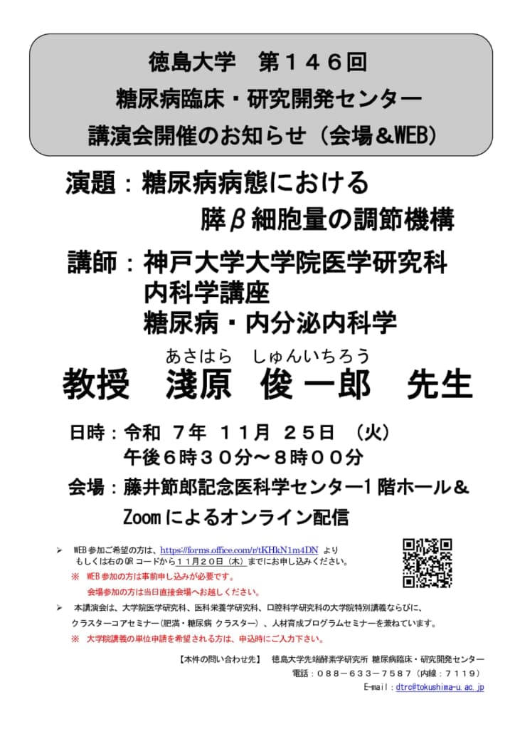 日時 令和7年11月25日(火)18:30〜20:00 開催形式 ハイブリッド開催会場:藤井節郎記念医科学センター1階ホール&Zoomによるオンライン配信※受講希望の方は、11月20日(木)までに、https://for […]