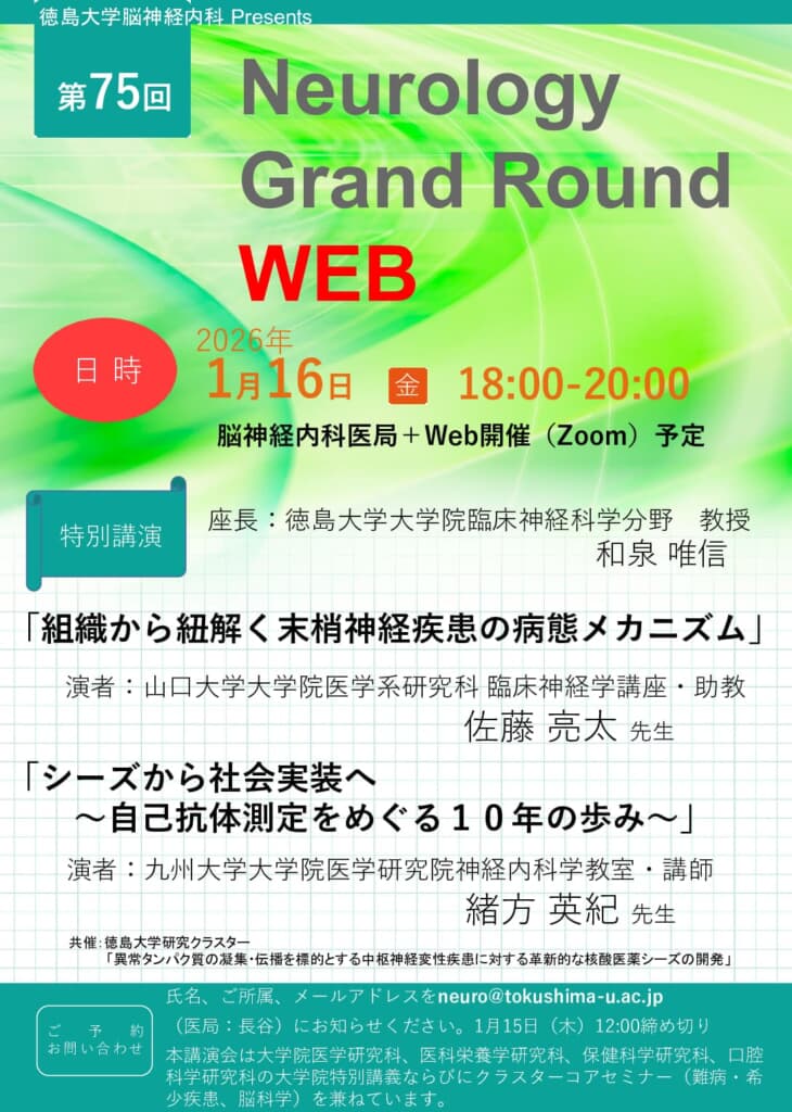 日時 令和8年1月22日(木)18:00-19:30 開催形式 脳神経内科医局+WEB開催(Zoom)予定※受講希望の方は、1月21日(水)12:00までに、 neuro@tokushima-u.ac.jp(臨床神経科学 […]
