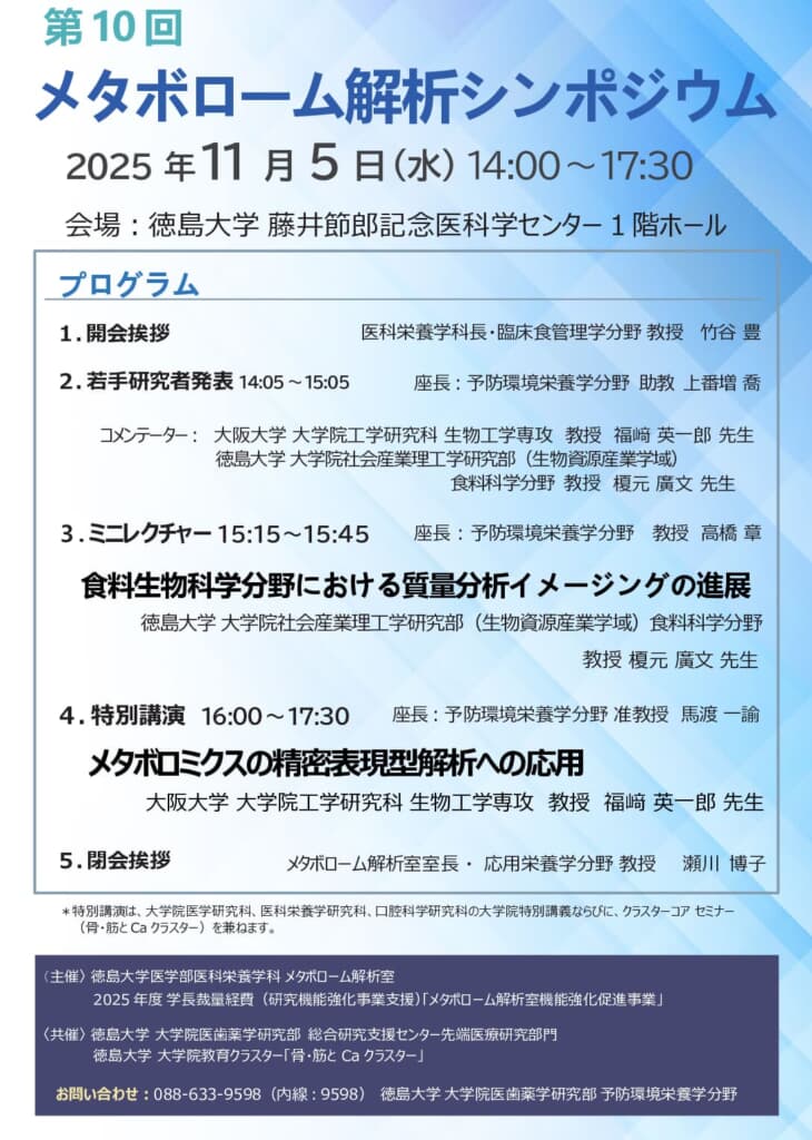 日 時 令和7年11月5日(水)16:00〜17:30 場 所 徳島大学 藤井節郎記念医科学センター1階ホール※シンポジウムの詳細については、案内PDFをご参照ください。 演 題 「メタボロミクスの精密表現型解析への応用 […]